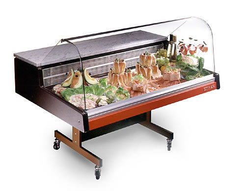 With its elegant design, IBIZA is ideal for hors d'oeuvres, wines, soft drinks, dairy products, gastronomic specialties and desserts. Fitted with stainless steel working shelf and removable trolley, it is also available with wooden finishing.